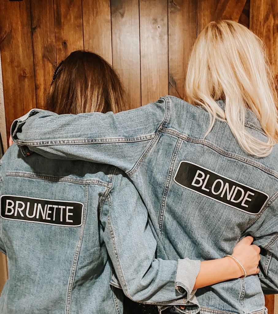 We all know that jean jackets are all the rage, but wouldn’t you love to have a custom jean jacket? Kellie was shopping and saw brunette/blonde jean jackets and knew we had to have them…unfortunately, they were $200! She decided to make her own version for a fraction of the cost and she gave mine to me for Christmas (how cute?!?!?).