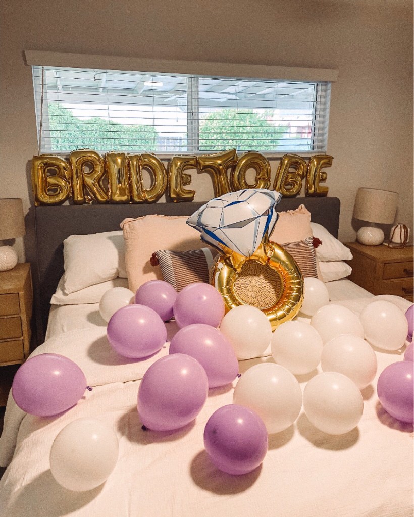 Lastly, we blew up a balloon banner that said “Bride to Be” and taped it above the bride’s bed. We also blew up a bunch of random leftover balloons to make it look festive.