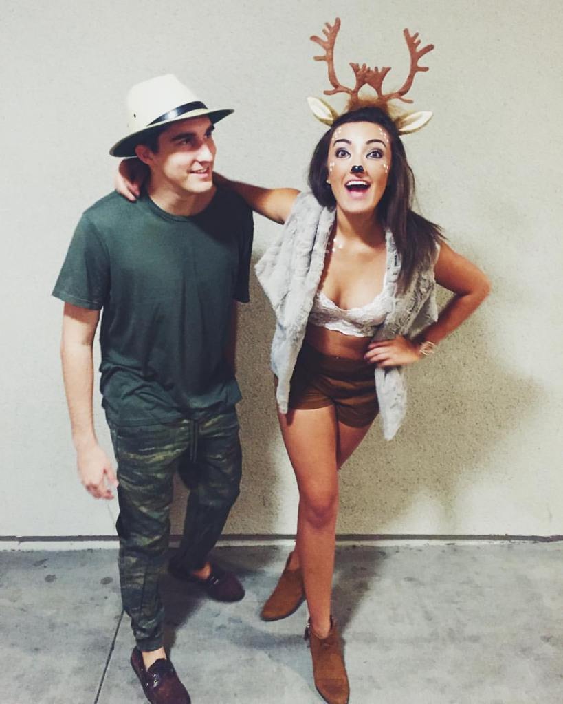 Deer and Hunter – Okay, this one was a bit more involved. I used a fur vest and suede shorts that I already had. I found the deer antlers at the costumes store and used paint (not face paint, but you should use face paint) to paint on my nose and the white dots. Be sure to over bronze on your cheeks and forehead, which makes the white dots stand out. For Stephen, we found camo pants and a hat at Target, but I’ll link some similar options.