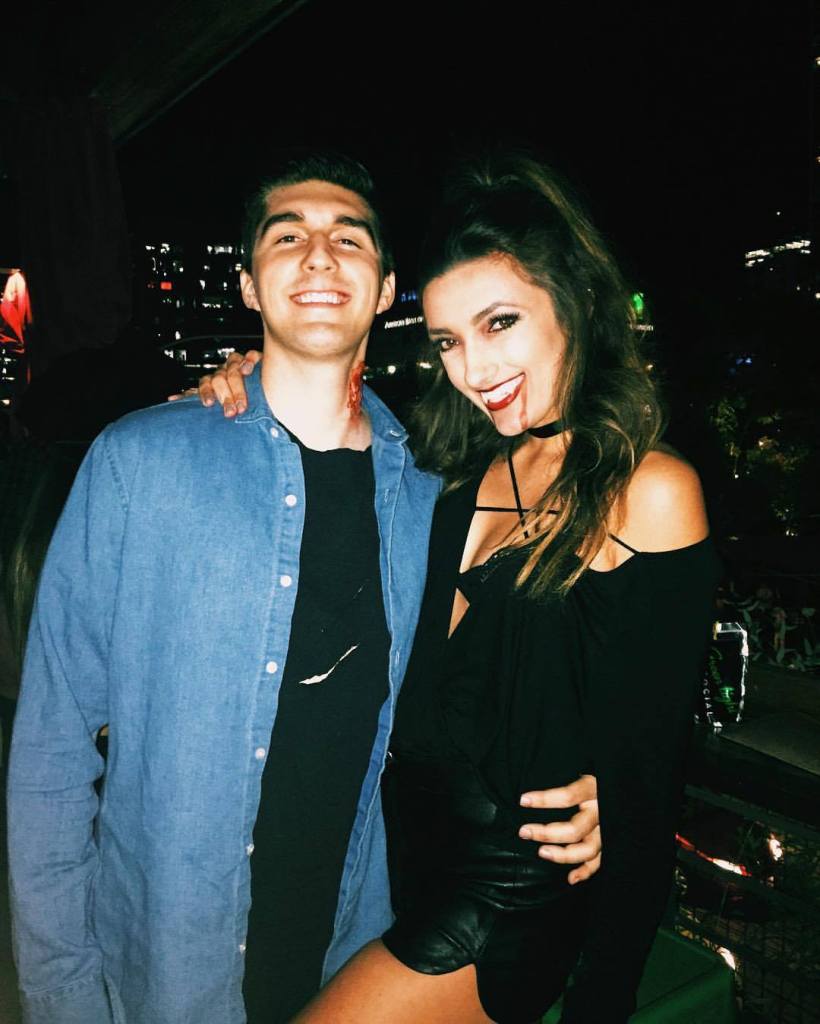 Vampire/Victim – For this one I wore all black (easy!) and purchased some vampire teeth from our local costume store. For Stephen, I ripped a black t-shirt and purchased an open wound from our local costume store (follow package instructions for application). I’ve linked similar options here. I used red lipstick to make the dripping blood lines down my face.