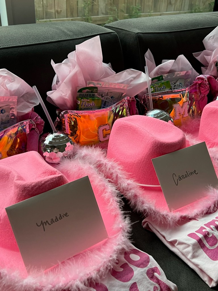 I made gifted the girls customized makeup bags filled with hangover kits, a tshirt, cowgirl hats, bandanas, a disco ball cup and a disposable camera for the weekend.